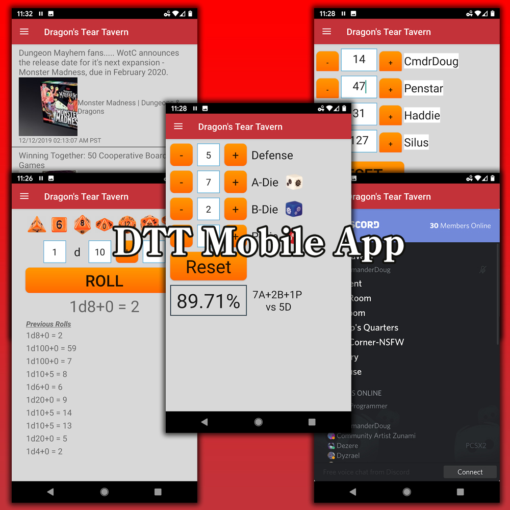 Once again Chris and Doug found themselves presented with an opportunity. When playing Monsterpocalypse, the community had to refer to printed out spreadsheets to calculate the chances of a monster or units attack success prior to the attack. Doug and Chris engaged a developer friend to help them convert those spreadsheets into a mobile app that made calculations extremely easy. While they were developing this feature, they quickly realized a convention gamer might also want some additional features like a dice rolling app, a 4-player score tracker, a quick way to get DTT’s curated gaming news, and a view into who was on the DTT Discord chat server at the time, all without needing an internet connection because everyone knows how well those work in a convention setting! With over 500 downloads on this gamer specific app, DTT Mobile is a proud tool in the toolbox.